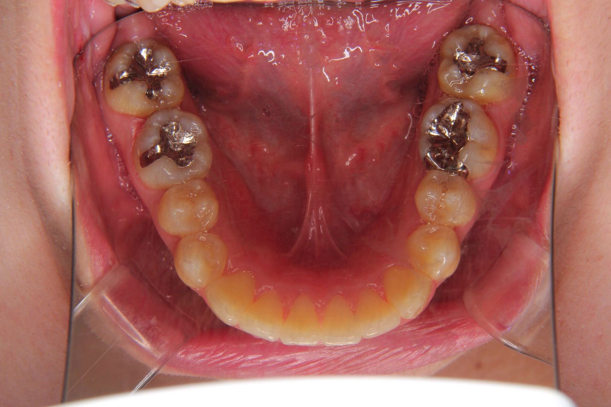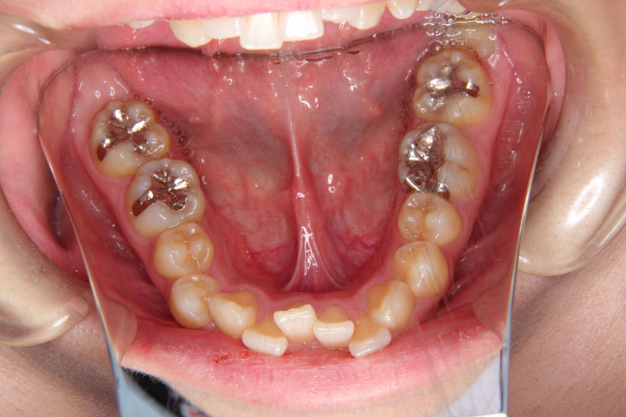 噛み合わせが深い(過蓋咬合)のため、下の前歯が内側に傾斜して、叢生ができている状態でした。このようなケースは、単純に歯の凸凹を改善しただけですと、すぐに装置をはずすと凸凹歯に後戻りしてしまうことが多くあります。