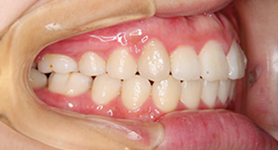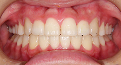 | 治療内容 | 抜歯をせずにマルチブラケット装置により矯正治療を行いました。歯列弓の拡大を行って上下の奥歯を後方へ移動させて歯がきれいに並ぶスペースを確保し、歯の幅も少し削って細くしきれいに並ぶように整えました。 今回のケースでは、アーチの拡大や後方移動が可能でしたが、ケースによっては、困難な場合もあり、歯ぐきが下がることもあります。そういった可能性が強い場合は、小臼歯抜歯を行うこともあります。 |