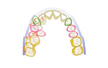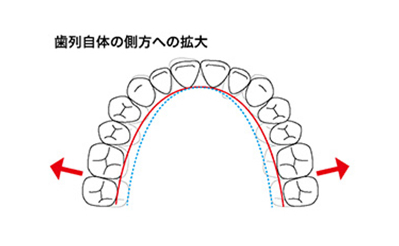 歯列の横幅をゆっくりと広げることで、歯をきれいに並べるためのスペースを確保します。顎の成長期のお子様だけでなく、成人の場合も骨の厚みを考慮しながら慎重に行います。