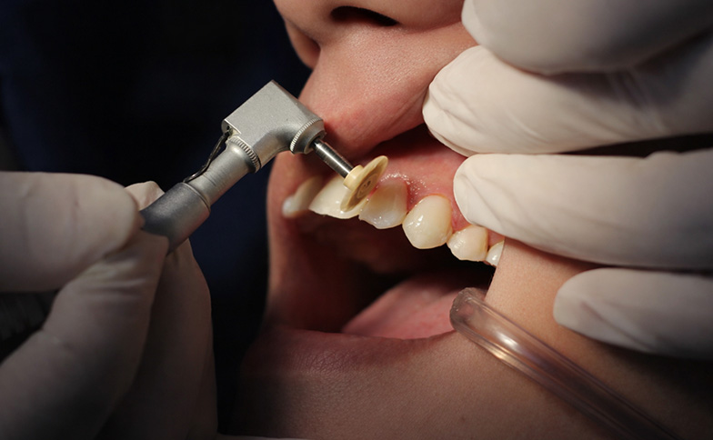 歯の表面(エナメル質)を数ミリ単位でわずかに削り、隙間を作ります。歯の健康に影響のない範囲で行い、抜歯をせずにガタガタを解消する有効な手段となります。